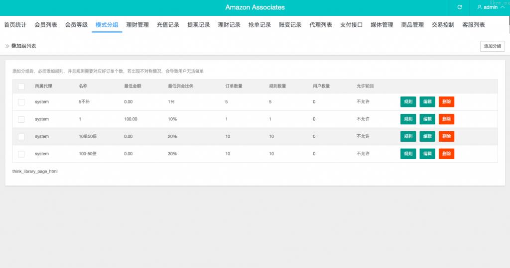 后端基于 ThinkPHP 框架,系统具备叠加组、打针、余额宝等功能,并支持 USDT 充值及权限代理管理后台。